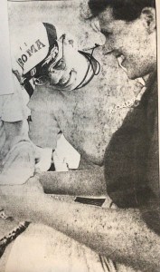 Grainy picture of Craig MacLean petting baby alligator. Photo by Wendy Berna